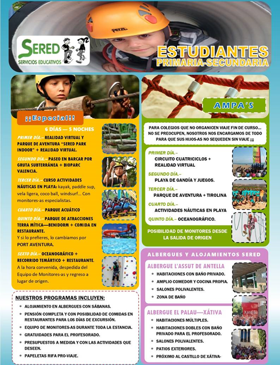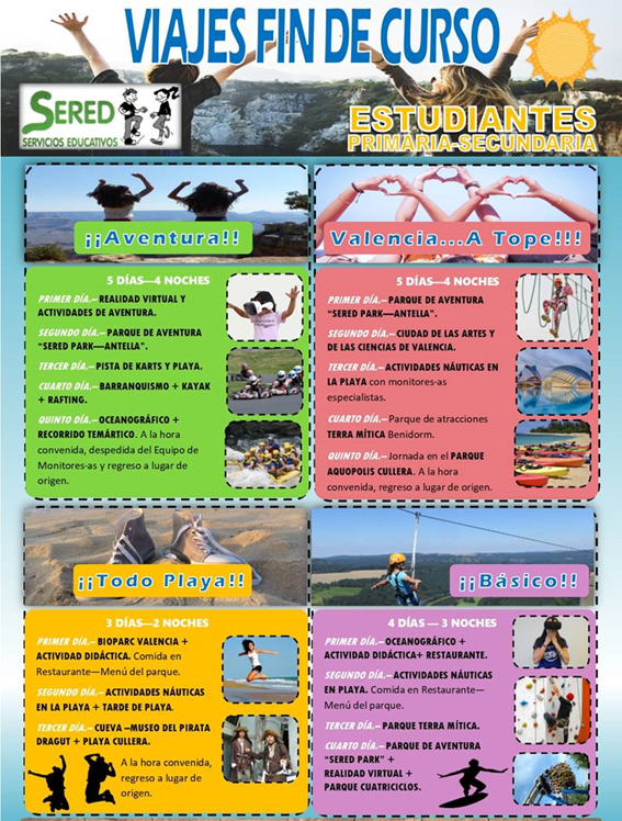 - Excursiones de uno o varios días con actividades de aventura, actividades náuticas, senderismo y rutas en BTT.